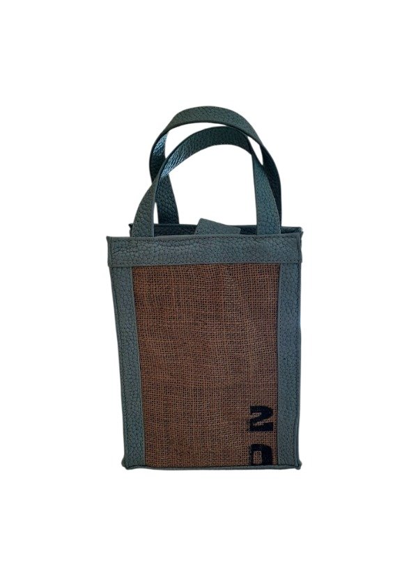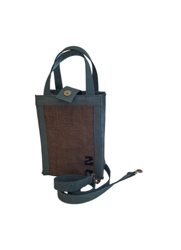 Cartera hecha con textil de saco de café y cuero vacuno. Adentro forrado.