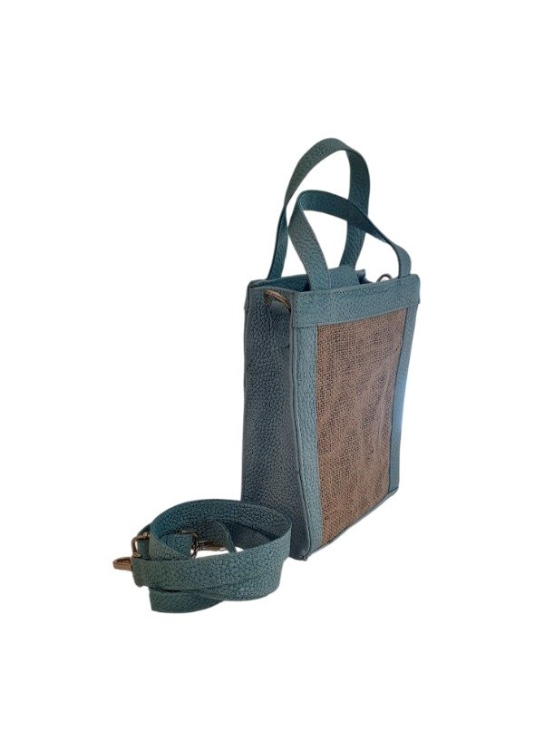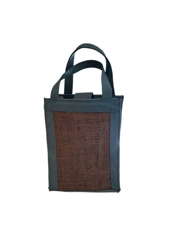 Cartera hecha con textil de saco de café y cuero vacuno. Adentro forrado.